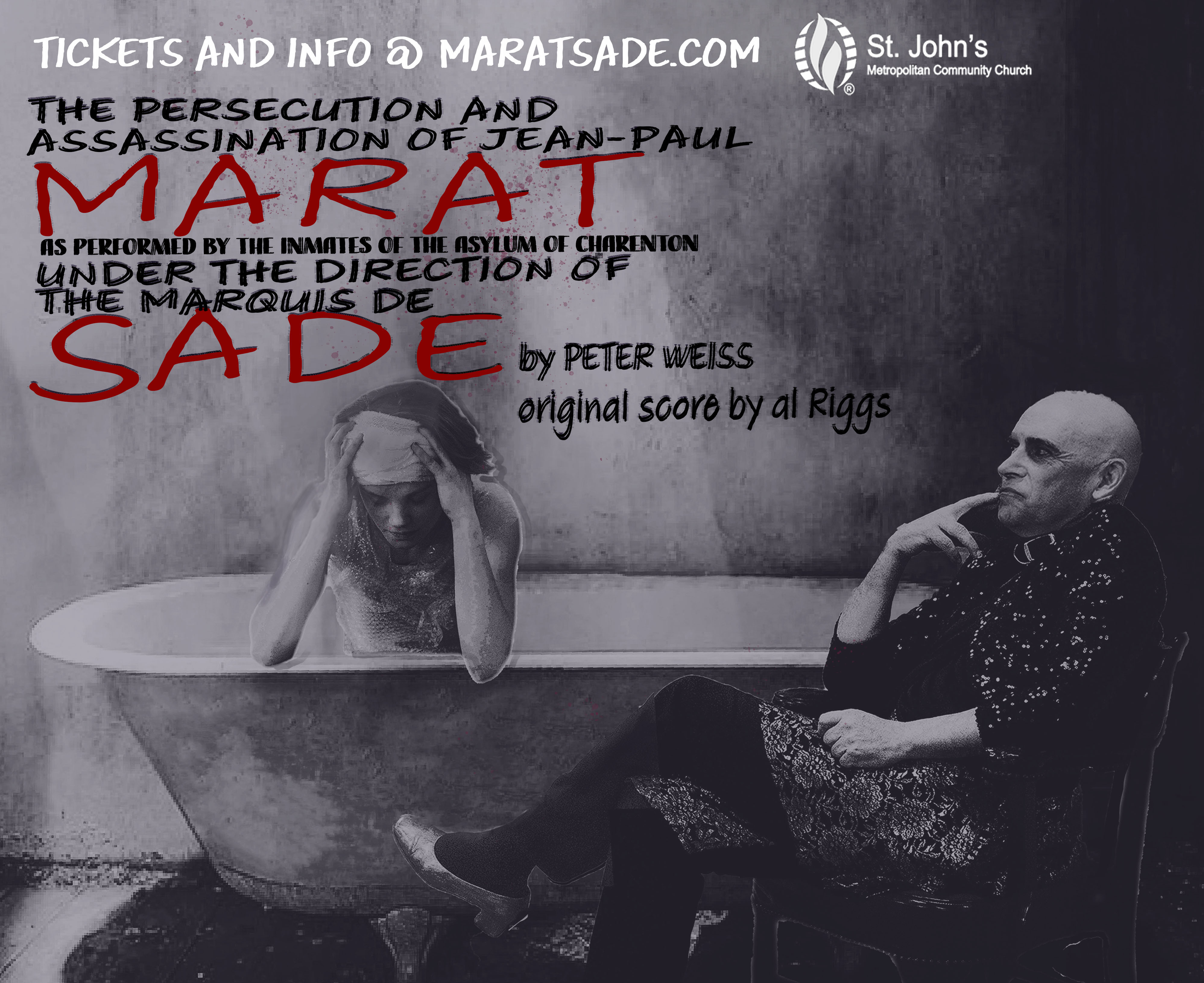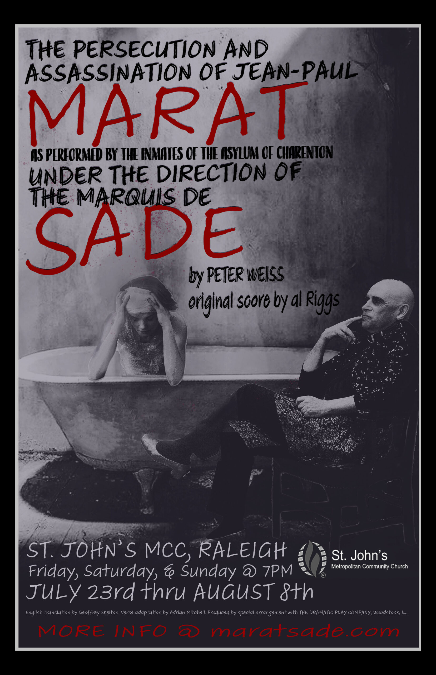 A new production of The Persecution and Assassination of Jean-Paul Marat as Performed by the Inmates of the Asylum of Charenton Under the Direction of the Marquis de Sade by Peter Weiss will be presented live and in-person July 23 – August 8 at St John’s Metropolitan Church in Raleigh, NC. It is produced by St. John’s MCC and directed by Dustin Britt. It is produced by special arrangement with Dramatic Publishing Company. The revolution will not be streamed.